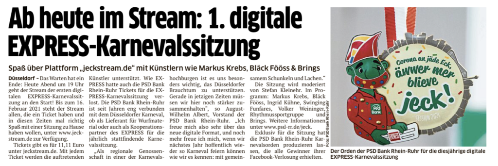 Über 1.100 „virtuelle Gäste“ haben vom 4. bis 16. Februar die Sitzung in ihren vier Wänden angeschaut und Ihr persönliches Karneval zu Hause gefeiert. Tickets konnten direkt auf Jeckstream gekauft werden. Dazu gab es die Möglichkeit, Freitickets als Express-Leser oder über unsere PSD-Kanäle (Facebook & Newsletter) zu gewinnen. Auf Facebook haben wir zudem 11 Karnevalspakete verlost, darunter neben den Freitickets einen exklusiven PSD Karnevalsorden, ein 5l Fass von Schumacher und vielen weiteren Überraschungen.