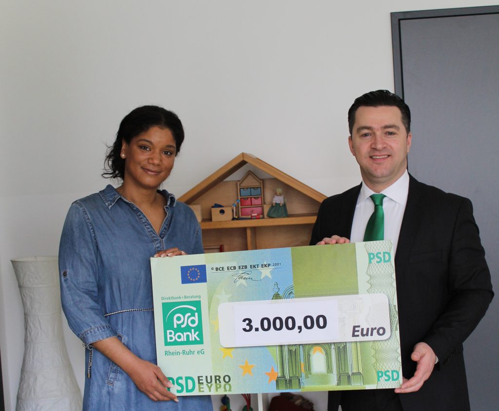 v.l. Kathrin Lorch, Kinderschutz-Zentrum, Mirsad Asani, Filialleiter PSD Bank in Essen